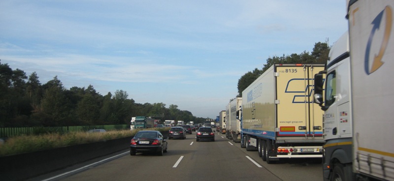 Zoals je ziet is het een beetje triest weer, maar het is droog en dus is het lekker weer om te rijden. Helaas is de fun van korte duur want een uurtje later staat het bij Frankfurt helemaal stil: