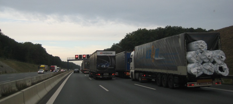 De matrixborden geven aan dat vrachtwagens hier niet mogen inhalen, maar zoals je ziet zijn er nog een flink aantal in overtreding. Ik besluit de linkerrijstrook te pakken en kan redelijk goed doorrijden. Iets verderop zijn wegwerkzaamheden en daar rijden de vrachtwagens stapvoets op de rechterrijstrook. De 2 rijstroken ernaast zijn niet breed genoeg voor mn camper en bovendien: als er 1 vrachtwagen iets te ver uitsteekt, heb ik mn spiegel of luifel eraf.